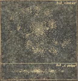 Рис. 8. Схема строения нашей звёздной системы — Галактики. Вторую группу составляет небольшое число так называемых планетарных туманностей, которые также входят в нашу Галактику. Они имеют вид круглых или кольцеобразных туманных пятнышек, в центре которых обязательно находится яркая и очень горячая звезда. Это — газовые туманности; в сравнительно слабые телескопы они представляются в форме круглых дисков, напоминающих диски планет, отчего они и получили своё название.