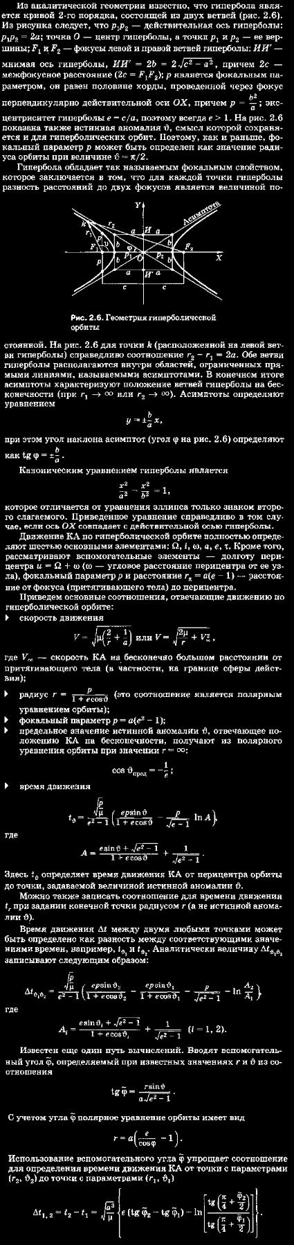Траектория межпланетного перелета КА от Земли к планете назначения может быть наглядно представлена в виде трех последовательных траекторий: на этапе отлета от Земли траектория является гиперболической (относительно притягивающего тела — Земли); после выхода из поля тяготения Земли траектория полета КА является эллиптической (относительно притягивающего тела — Солнца); при входе в поле тяготения планеты КА снова будет двигаться по гиперболической траектории (относительно притягивающего тела — планеты). Из сказанного ясно, что изучение гиперболического движения имеет большое практическое значение.